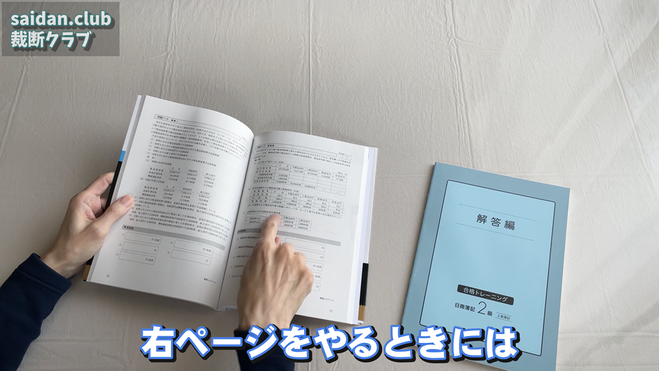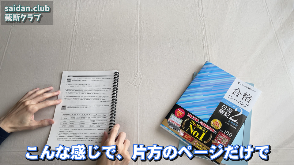 こちらの合格トレーニングの本なんですけれども、レイアウトは非常に良くて使いやすそうなんですけれども、実際勉強するときに左側のページをやるときなんかはですね、こちら右側で計算とかするかと思うんですけれども、こちらの部分、邪魔ですよね。