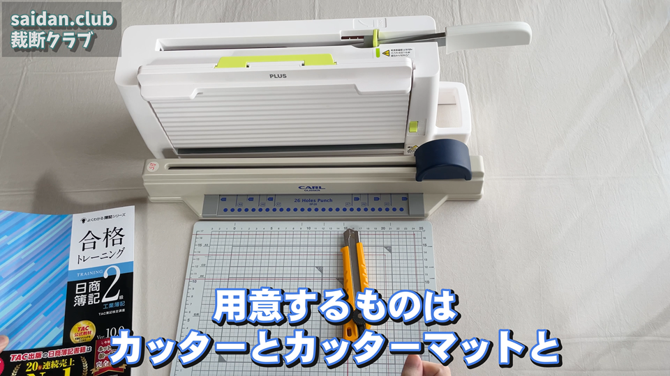 用意するものはですね、カッターとカッターマットと裁断機とこちら穴開け器ですね。それカットしていきます。