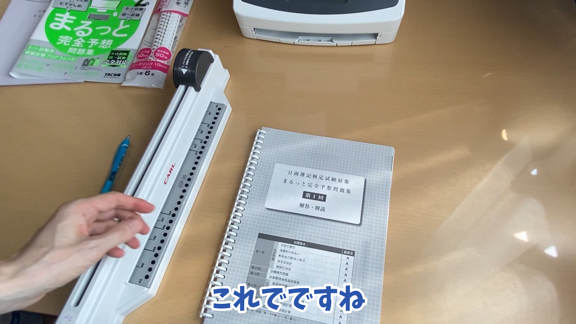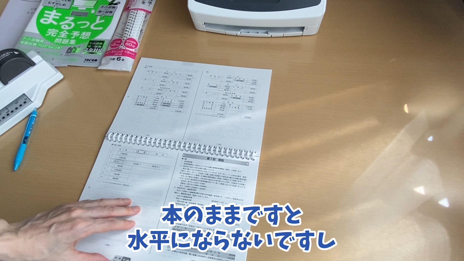 まるっと完全予想問題集の大きさなんですけれども 4サイズでちょっと大きすぎて非常にですね使いづらいかと思いますのでこれをスキャナーで読み込んで本試験問題集と同じB5のサイズにしてプリントアウトしていきたいと思います。