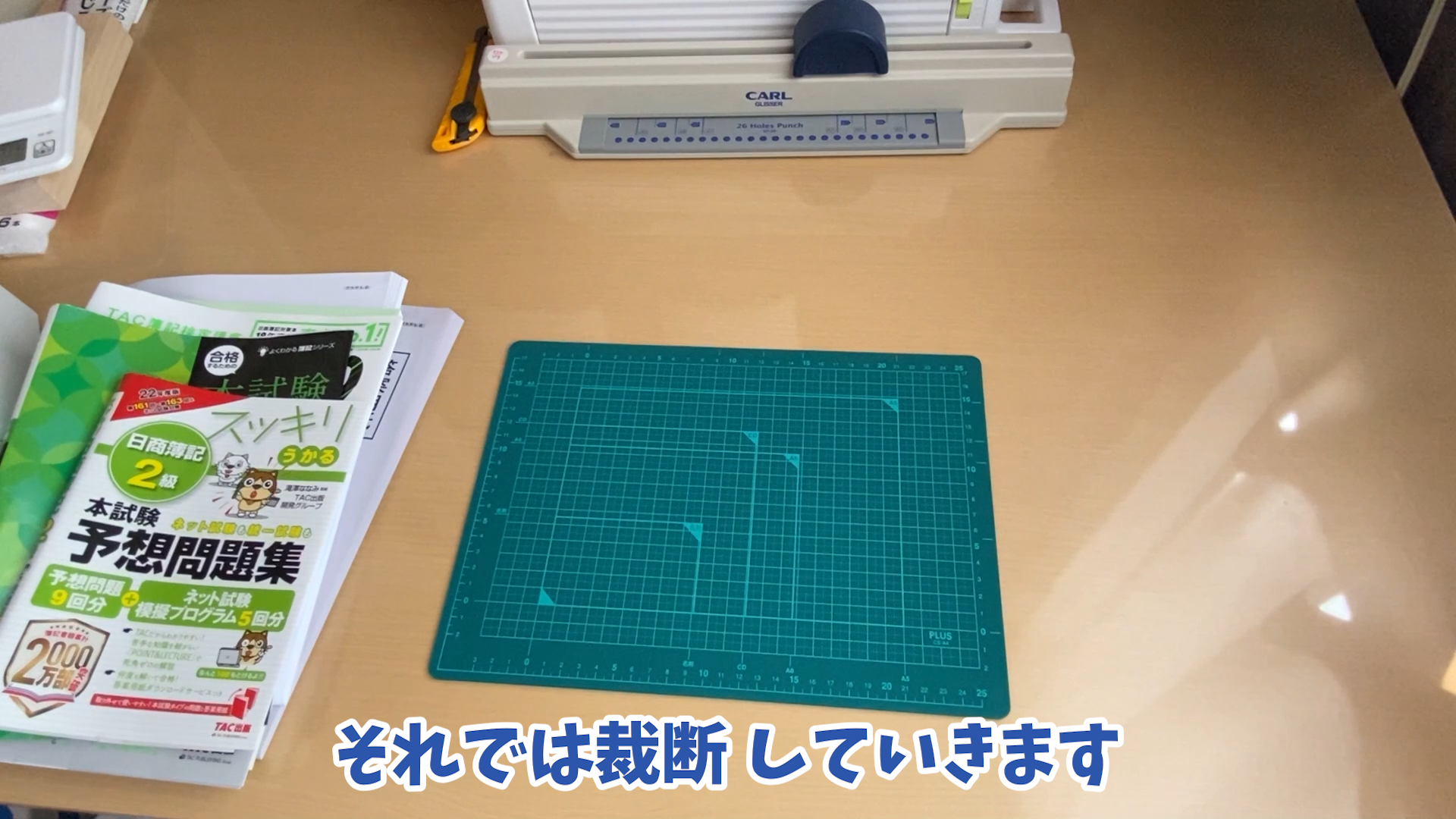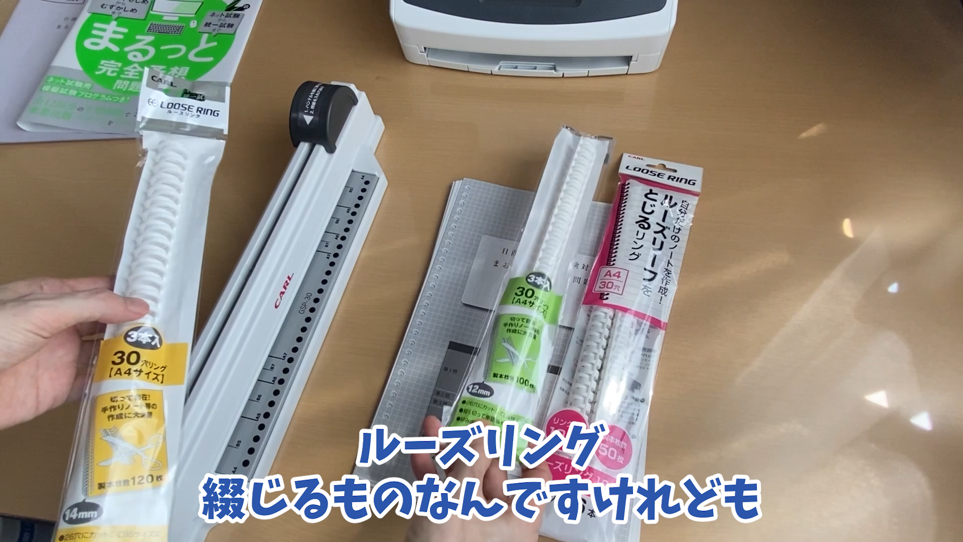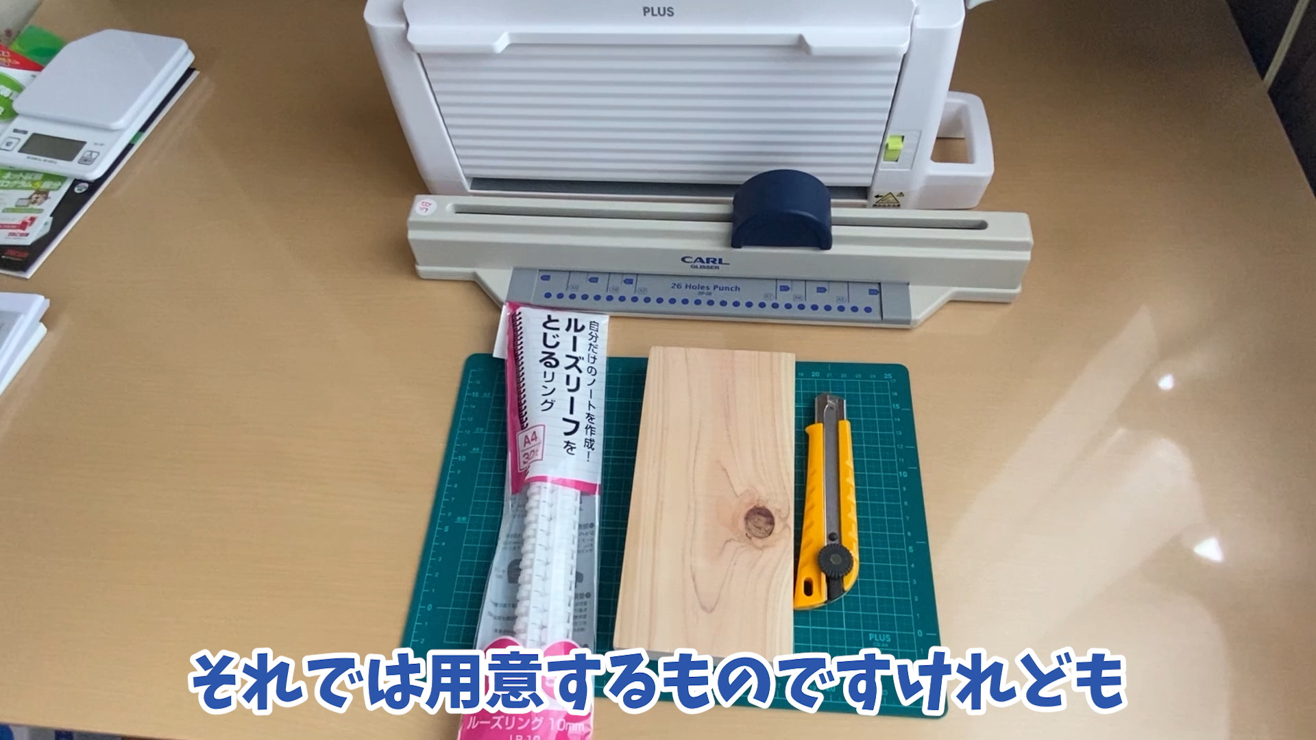 それでは用意するものですけれどもカッターとこちらが本を 押さえる用の木ですねそれとこちらルーズリングですねそれと穴をあける グリッサーという機械とプラスという会社 から出ている裁断機です